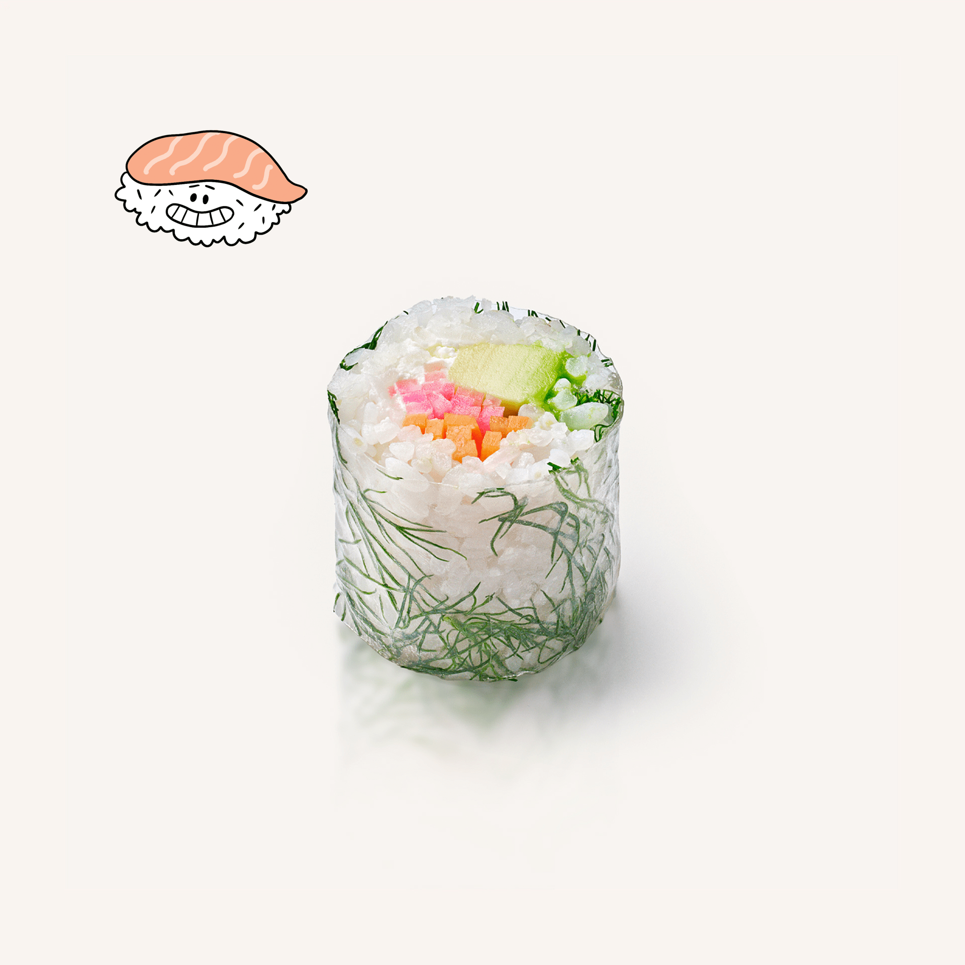 Un roll à la fois sobre et précis : avocat, carotte, betterave chioggia, aneth et cream cheese.